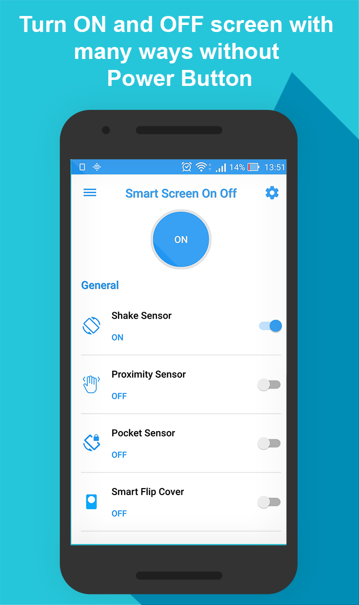 With "Smart Screen On Off" you can turn on/off the screen your device don't need power Button by many ways below: